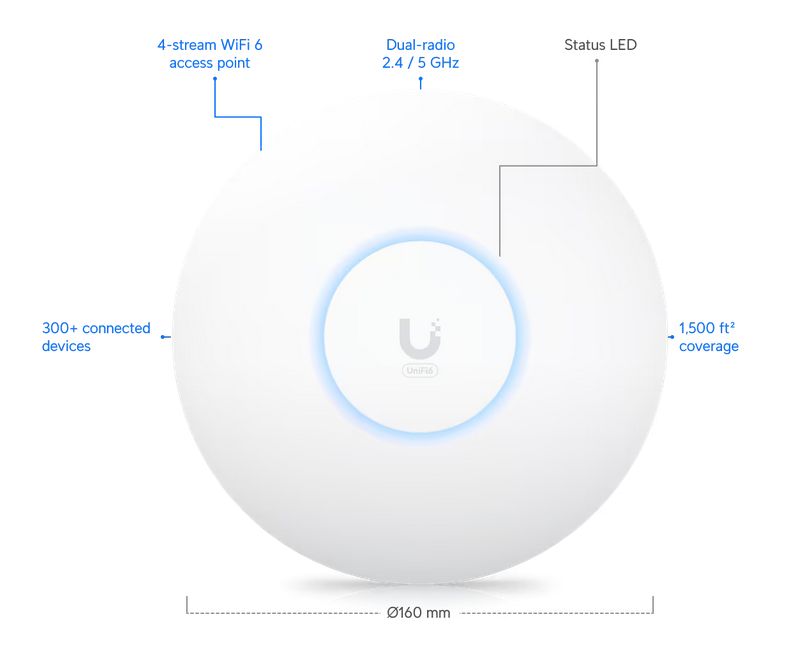 El Ubiquiti U6+ Wireless Access Point es un punto de acceso WiFi 6 de última generación, diseñado para ofrecer una conexión rápida, estable y de alta capacidad. Su diseño compacto de Ø160 x 33 mm y montaje en techo lo convierten en una solución elegante y discreta para oficinas, locales comerciales o viviendas inteligentes.